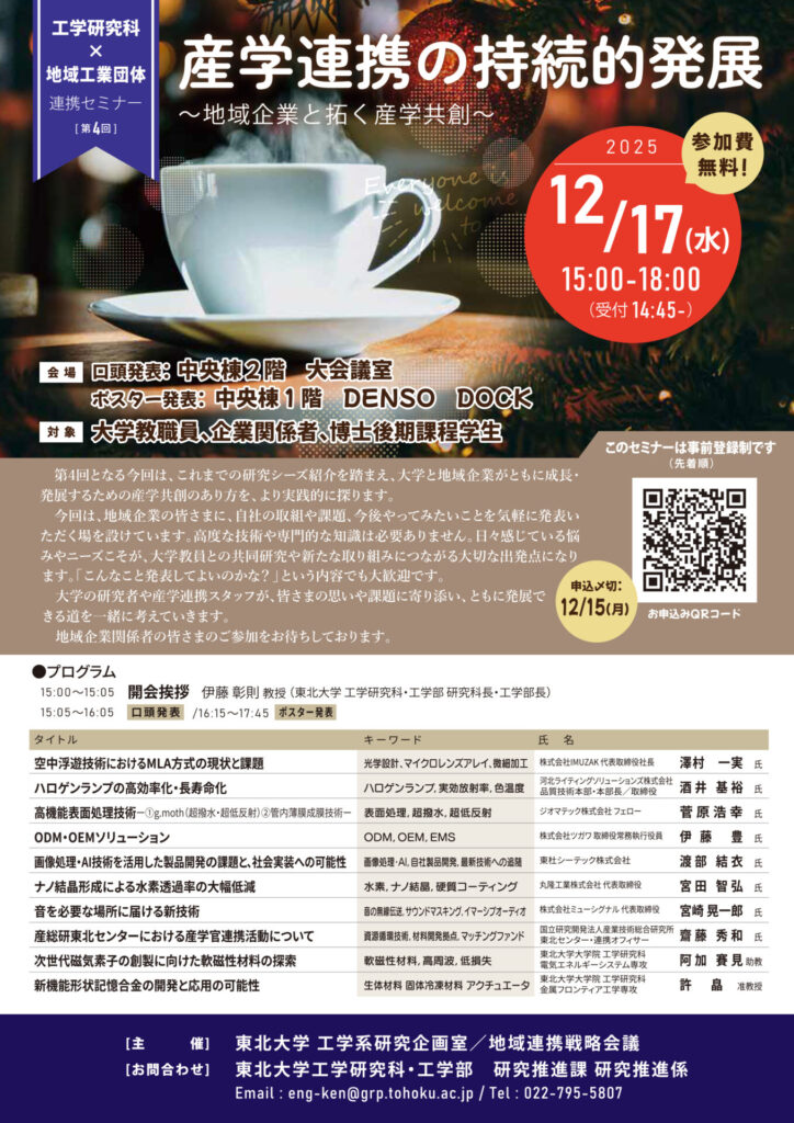 12月17日(水)、「第4回東北大学工学研究科X地域工業団体連携セミナー 産学連携の持続的発展~地域企業と拓く産学共創~」に弊社社員が登壇します。