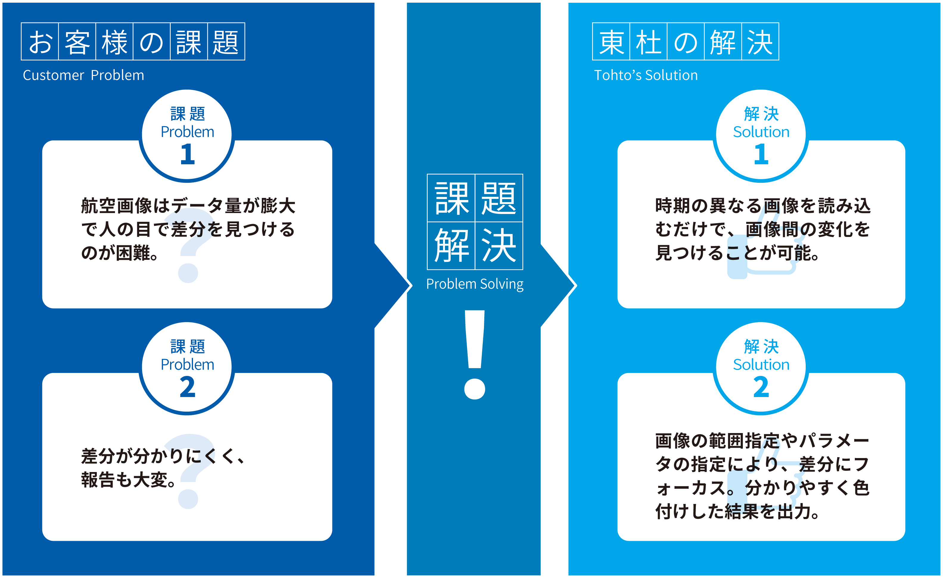 「空中写真変化検出システム」は、ドローンなどで撮影した時期の異なる空中写真を比較し、植物の成長度合いや河川ブロックの破損などの変化を検出するシステムです。発見した変化を出力することも可能です。