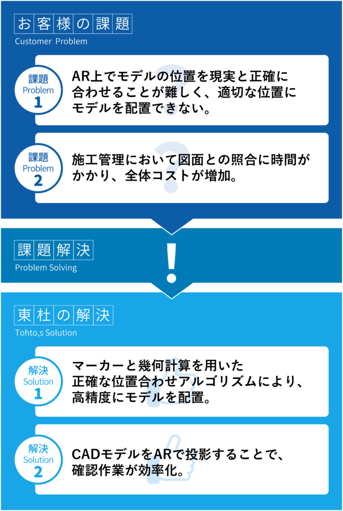マーカーの位置と自デバイスの位置を推定しモデルの高精度な重ね合わせを実現。