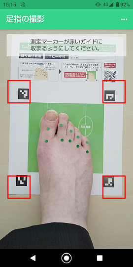 測定シートに足をのせて、四隅の赤枠にマークを合わせます。